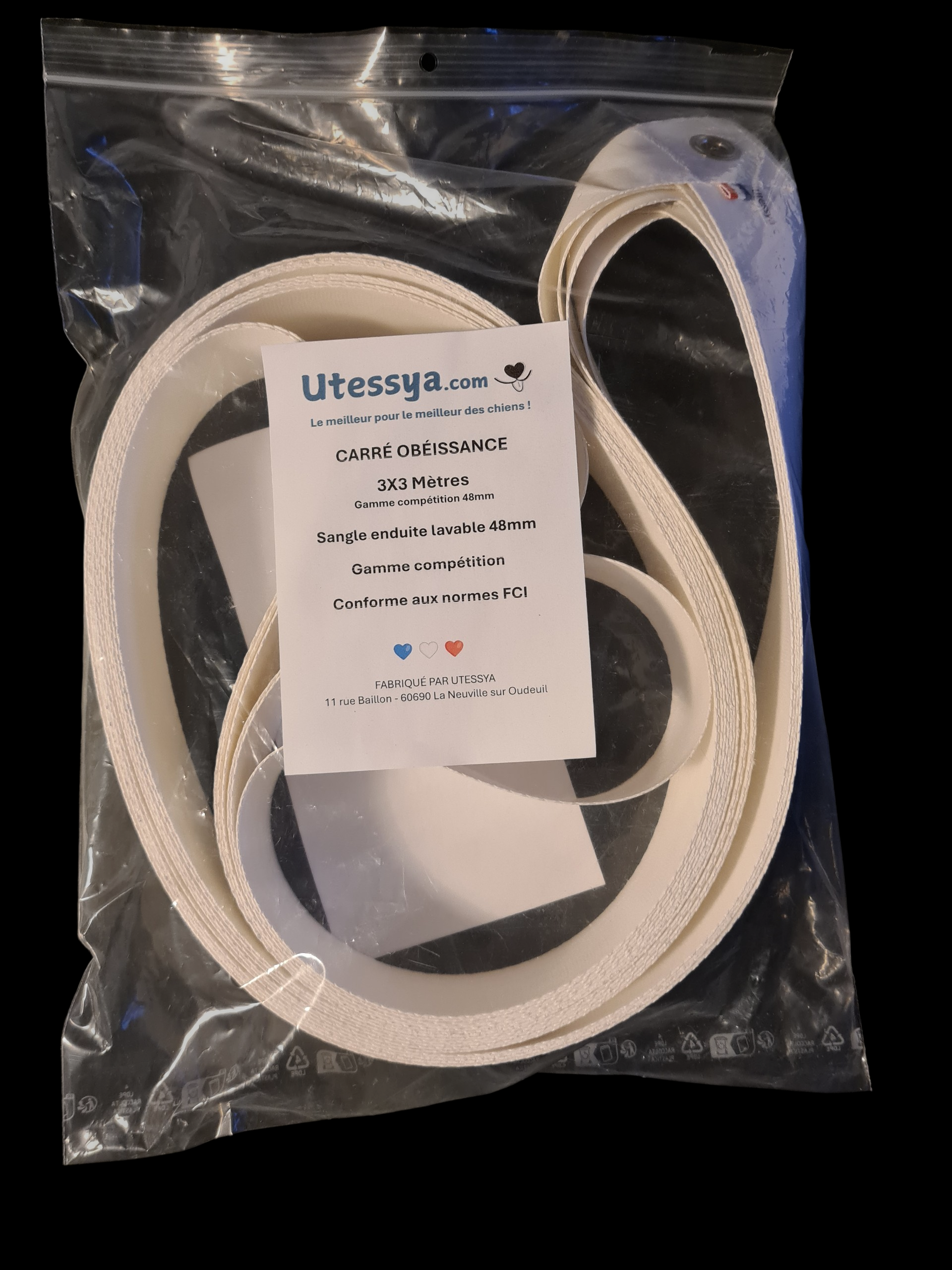Carré d'obéissance 48mm lavable eau claire de 3x3 conforme au règlement FCI. Le carré est fabriqué à la main avec une sangle en Polypropylène enduite pvc de 48mm de large. C'est une exclusivité et une innovation Utessya . Cette sangle enduite est lavable à l'eau claire avec une éponge ou un chiffon, fini les sangles couleurs terre que l'on ne distingue plus et qui finissent dans votre lave linge. Nous disposons 4 œillets en laiton nickelé [qui ne rouilleront pas]. Les angles sont collés et cousus solidement pour augmenter la résistance. Couplée à 1 kits de 4 piquets extra plats [non fourni], vous obtiendrez une zone de conduite extrêmement visible et très sécurisante.