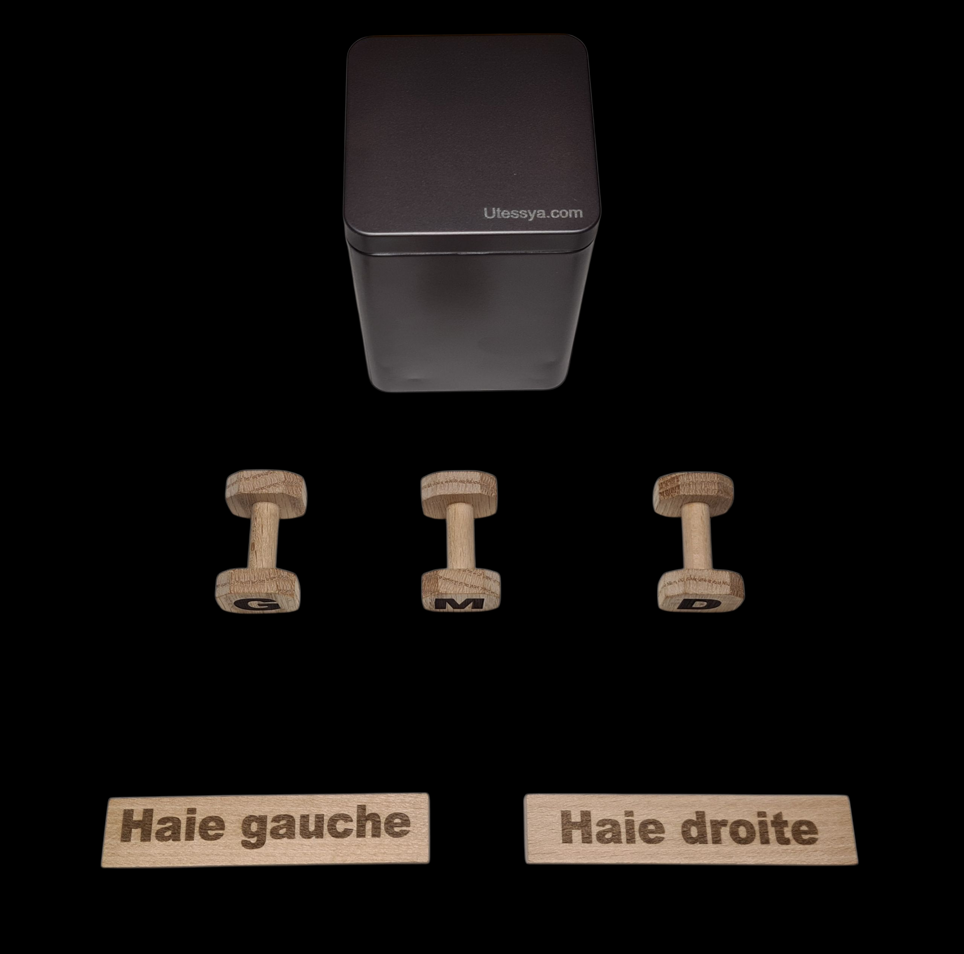 Ce kit est composé de 3 minis apportables Droite Milieu Gauche et de 2 Barettes pour le tirage au sort de la haie, présenté dans une boite métallique couleur anthracite avec des mousses de calage.